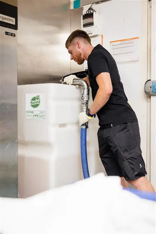 Onze chauffeur sluit de slang rechtstreeks aan op de bulktank in jouw keuken of opslagruimte. De frituurolie wordt veilig en hygiënisch bijgevuld, zonder morsen of verpakkingsafval. Alles verloopt vlot tijdens dezelfde route waarop ook je gebruikte olie wordt opgehaald.